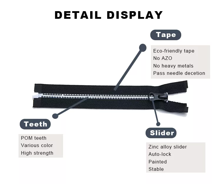 Молнии TRC из переработанного пластика изготовлены из высокопрочных формованных пластиковых зубцов и обладают превосходной устойчивостью к деформации, истиранию и многократному использованию. Легкая и прочная полиэфирная лента также повышает гибкость и комфорт молнии, что делает ее идеальным выбором для одежды, туристического снаряжения, багажа и других предметов, где производительность и долговечность имеют решающее значение.