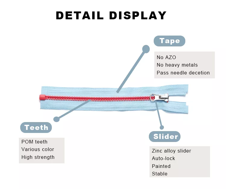 Стандартная пластиковая молния TRC отливается под давлением из полиоксиметилена или других высокопрочных полимерных материалов, что обеспечивает правильную форму зубцов, а также превосходную гладкость и исключительную износостойкость во время использования. Их поверхности поддерживают различные цветовые обработки и обладают превосходной стойкостью цвета, что позволяет цветам оставаться яркими в течение длительного времени. Кроме того, в сочетании с высокопрочной полиэфирной лентой общая конструкция становится более прочной и долговечной, отвечающей требованиям частого ежедневного использования.
