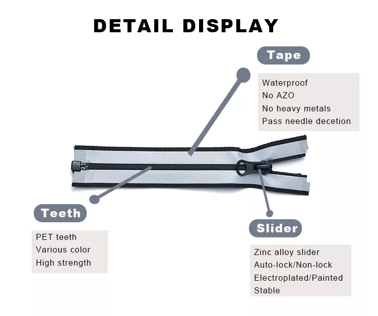 Водостойкие нейлоновые молнии TRC изготовлены из нейлоновых зубцов высокой плотности и армированной полиэфирной ленты, покрытой прочной пленкой ТПУ или ПУ. Это создает бесшовный барьер, который обеспечивает эффективную водонепроницаемость, сохраняя при этом гибкость и плавность работы молнии. Этот продукт, предназначенный для наружного и высокопроизводительного применения, обеспечивает надежную стойкость к истиранию, коррозии и деформации. Водонепроницаемая нейлоновая молния TRC обеспечивает идеальный баланс между функциональной защитой и современным дизайном, гарантируя, что каждая деталь будет одновременно стильной и функциональной, независимо от того, используется ли она в куртках, спортивной одежде, рюкзаках, палатках или защитном снаряжении.